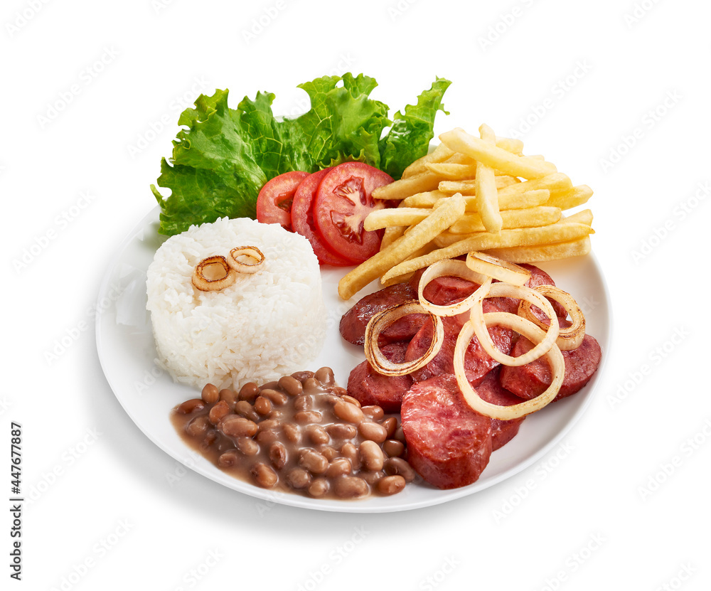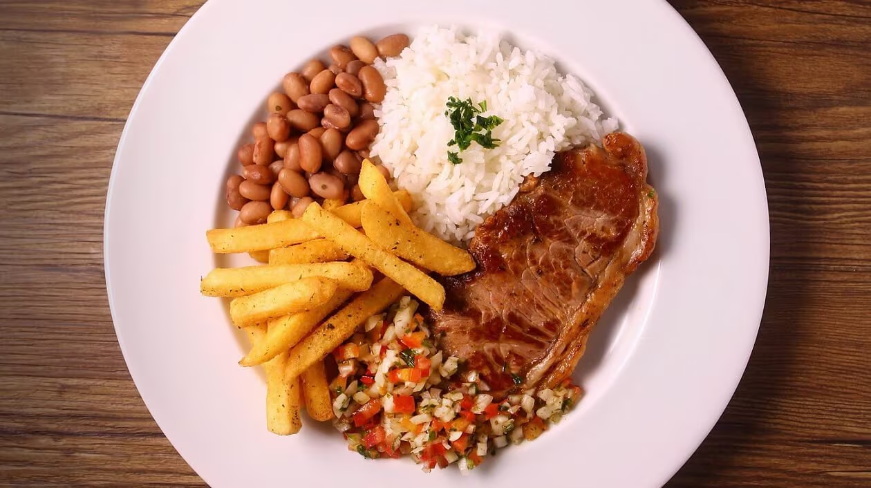Arroz, feijão, fritas e farofa