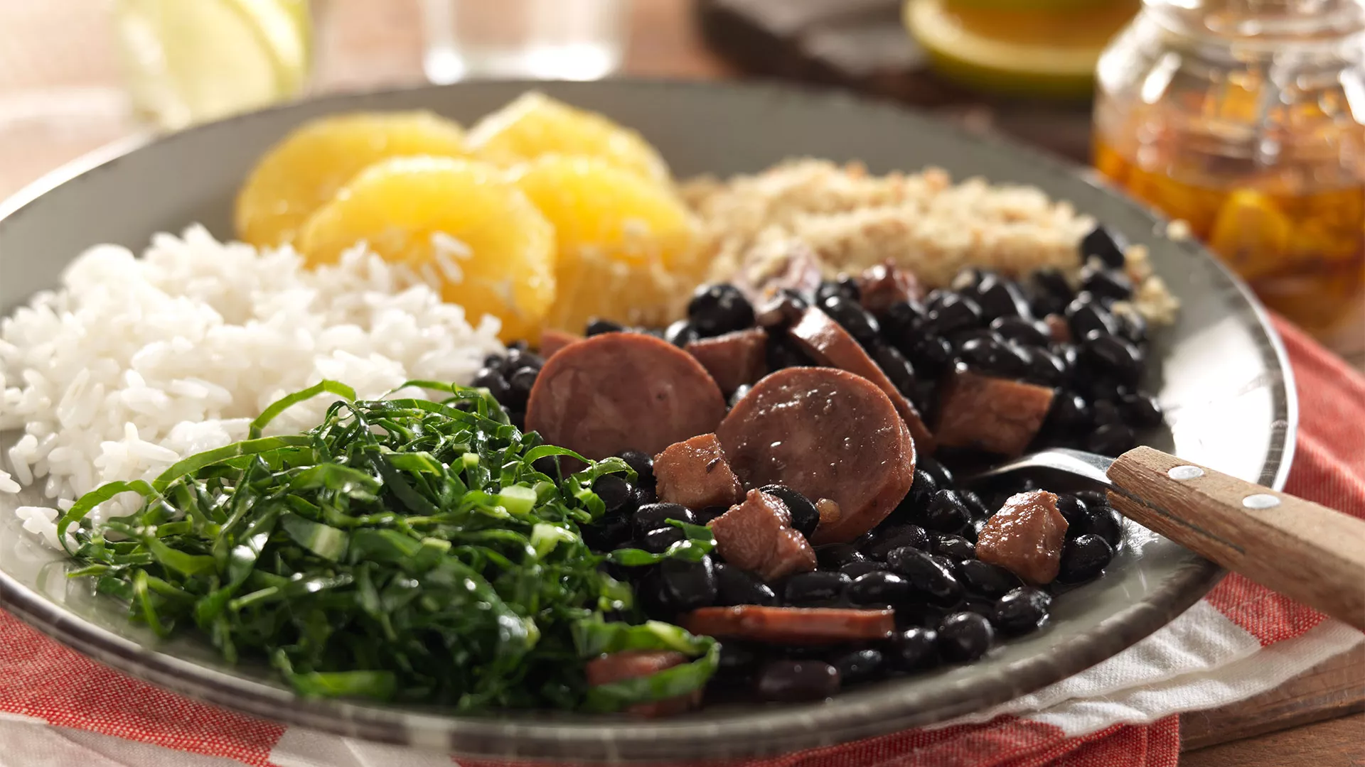 Arroz, feijão preto, couve e bisteca